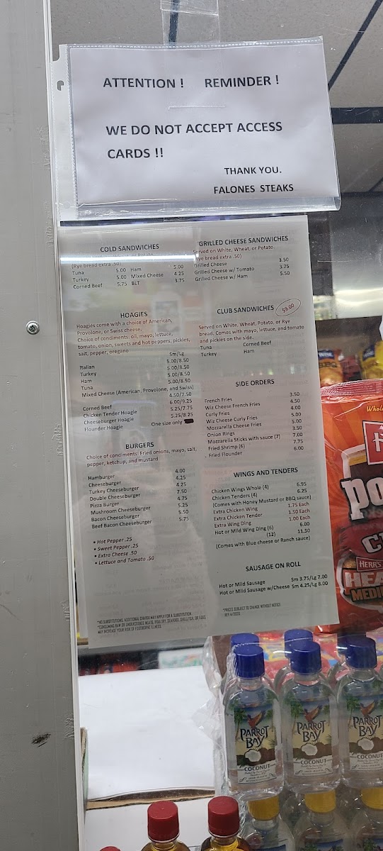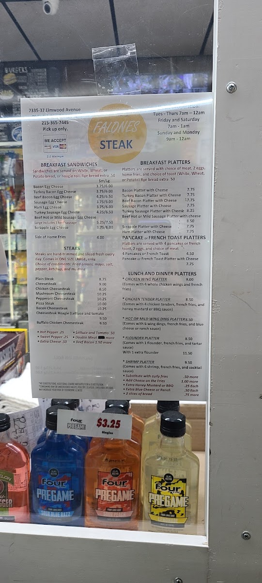 Welcome to Falone's Steaks & Hoagies, a true gem nestled in the heart of Philadelphia at 7337 Elmwood Ave. This cheesesteak restaurant is renowned for its authentic flavors and commitment to quality. The menu showcases a delectable variety of cheesesteaks, from the classic Plain Steak to tantalizing options like the Mushroom Cheesesteak and Mixed Pepper Cheesesteak, all starting at just $9.25.
